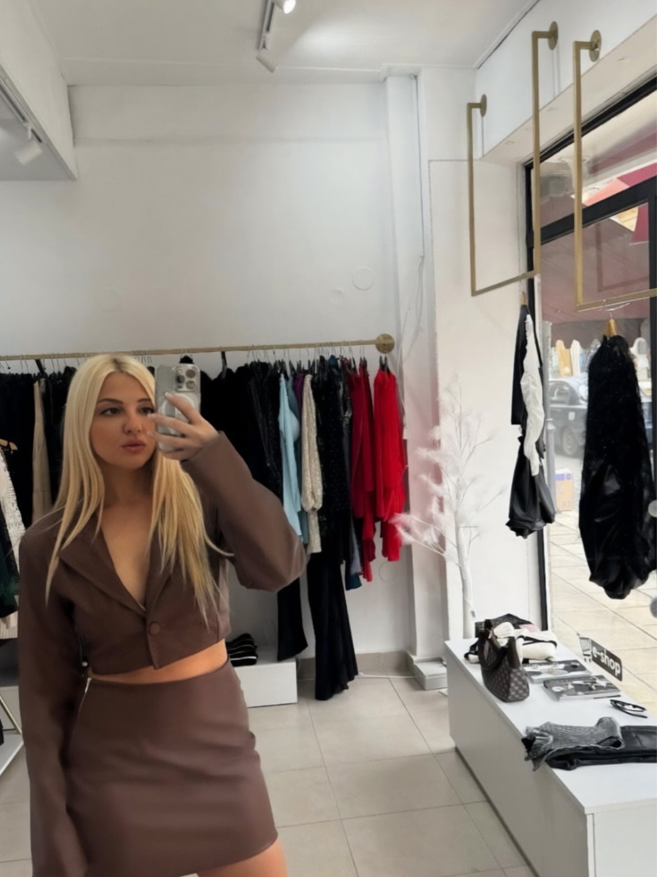 Ανανεώστε την γκαρνταρόμπα σας με αυτό το εντυπωσιακό σετ σε καφέ απόχρωση, που συνδυάζει φούστα και crop jacket. Το σακάκι διαθέτει μοντέρνα γραμμή και ελαφρώς oversized εφαρμογή, προσφέροντας τόσο στυλ όσο και άνεση. Η φούστα έχει κομψό σχέδιο, αναδεικνύοντας τη σιλουέτα σας με κάθε κίνηση. Αυτό το σετ είναι ιδανικό για κάθε περίσταση, από χαλαρές εξόδους μέχρι βραδινές εκδηλώσεις. Ένα must-have κομμάτι που θα σας συνοδεύσει σε πολλές περιστάσεις. Tο one size καλύπτει από small έως large.