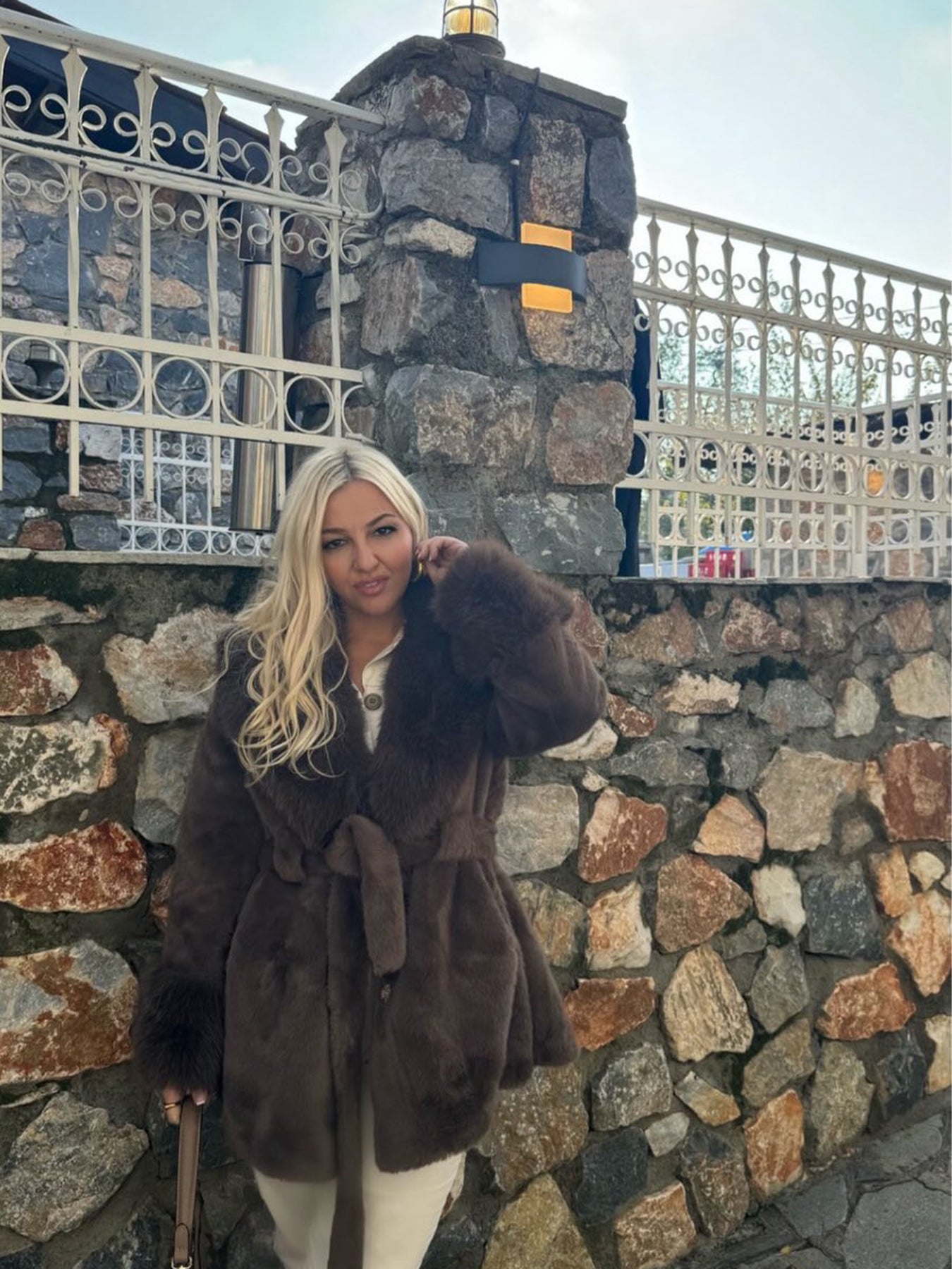 Αναδείξτε το χειμερινό σας στυλ με αυτό το πολυτελές καφέ γούνινο παλτό. Διαθέτει απαλή υφή που προσφέρει αίσθηση ζεστασιάς και άνεσης, ενώ η ζώνη στη μέση τονίζει τη σιλουέτα με κομψό τρόπο. Οι φαρδιές μανσέτες και ο πλούσιος γιακάς χαρίζουν επιπλέον φινέτσα και θηλυκότητα. Η κουκούλα προσθέτει πρακτικότητα και επιπλέον φινέτσα, κάνοντάς το ιδανικό για τις πιο κρύες μέρες. Ιδανικό για κομψές εμφανίσεις από το πρωί έως το βράδυ.